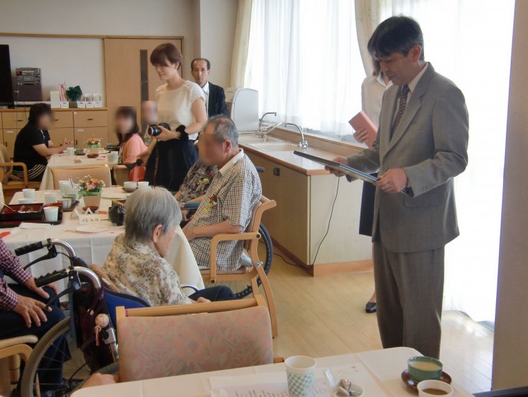 | 松花堂弁当・デザートバイキングでお祝いです。いつもより豪華なお弁当・デザートで皆さん大満足の様子でした。 | 3名のお祝い者の方がいました。施設長から表彰をうけています。その後はそれぞれの特技を披露して下さいました。 |