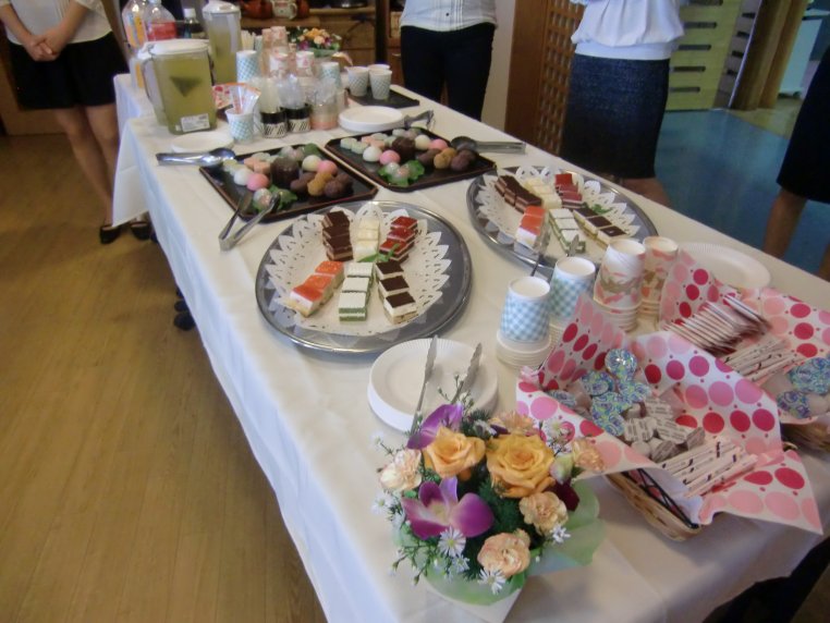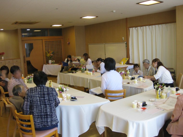 | 皆さんにお花をプレゼント、喜んでもらえてとても嬉しかったです。これからも一緒に楽しい時間を過ごしましょうね。 | 食後はデザートバイキングでケーキやおまんじゅうを召し上がっていただきました。 |