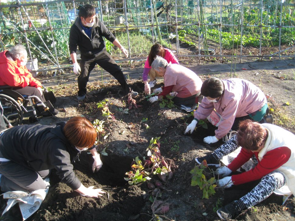 芋掘り 2019年12月03日 Topics デイサービスの利用者と芋掘りを行いました。今年はツルの成長が悪く、あまり期待していなかったのですが、かなりの出来の良さ。2、3週間眠らせて、おやつの時間に焼き芋にして食べるのがたのしみです。